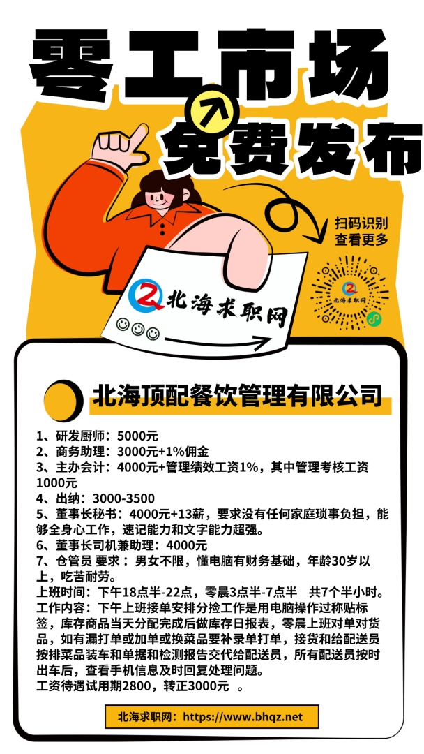 零工招聘 > 研发厨师、商务助理、主办会计、出纳、董事长秘书、司机、仓管员